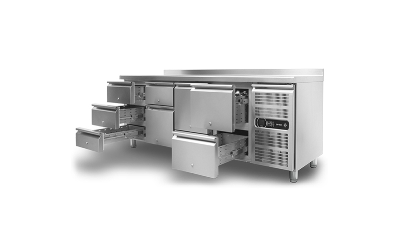 A new line of refrigerated counters featuring drawers with a larger capacity and made to the highest standards, which meet the needs of today’s professional cooking industry: